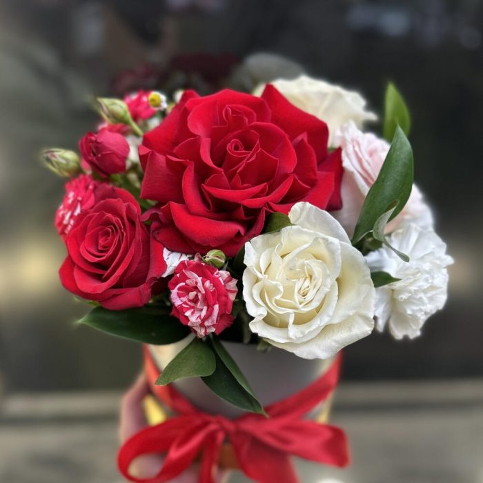 Роза – 4 шт. Кустовая роза – 2 шт. Зелень – 1 шт. Диантус – 2 шт. Коробка шляпная – 1 шт. французская красная роза – 1 шт.
