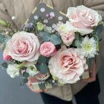 роза одноголовая пинк мондиаль – 3 шт.куст роза – 1 шт.эустома белая – 2 шт.Хризантема кустовая – 1 шт.Эвкалипт – 1 шт.Гипсофила – 1 шт.Зелень – 1 шт.