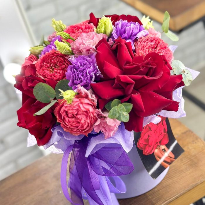 Эвкалипт – 1 шт.Роза Эксплорер – 3 шт.Лизиантус махровый – 2 шт.Открыточка с вашими пожеланиями – 1 шт.роза садовая пионовидная – 2 шт.диантус лавандовый – 1 шт.шляпная коробка с лентами и оазисом – 1 шт.