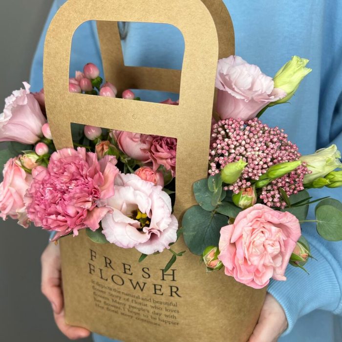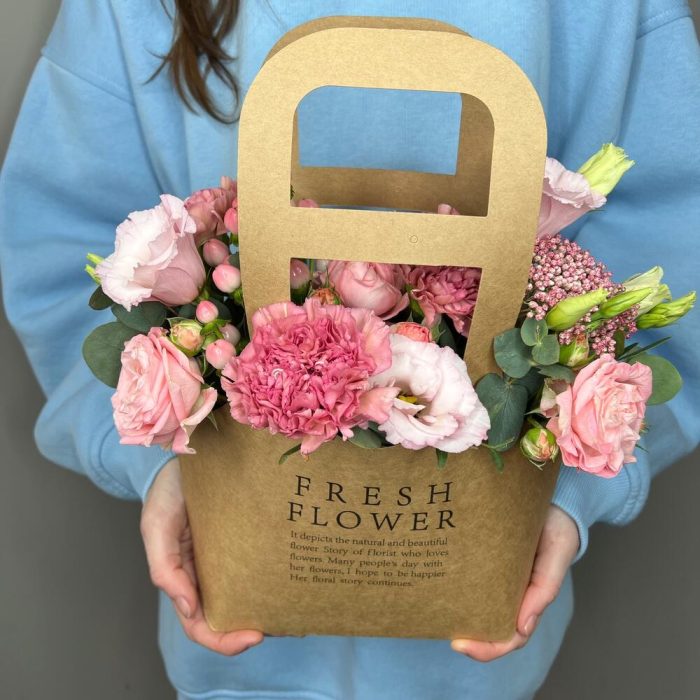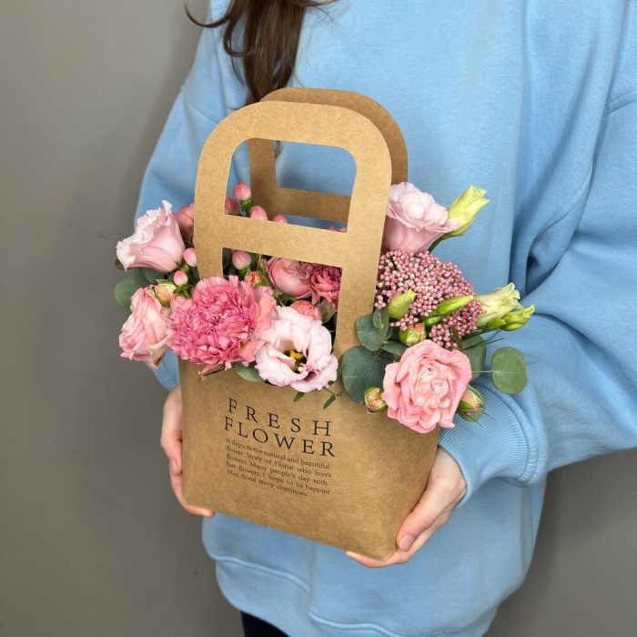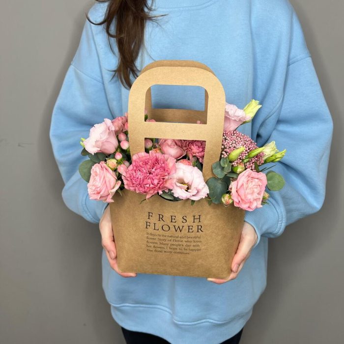 Цветы в стильной крафтовой сумочке, внутри сумочки расположен флористический оазис пропитанный водой, который позволяет цветам оставаться свежими долгое время.Инструкция по уходу за цветами:1. Поливайте композицию 1 раз в 2 дня (только в центр композиции). Наливайте прохладную воду, не более 100-150 мл. 2. Берегите цветы от сквозняка и перепадов температур;3. Не оставляйте цветы рядом с фруктами. Дарите радость своим близким вместе с цветочной лавкой «Polyanka»