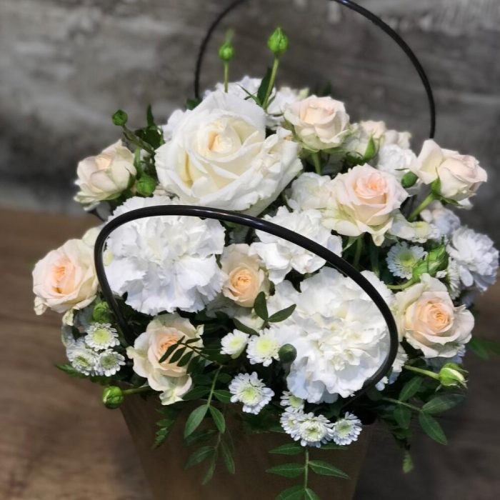 Роза кустовая – 2 шт.Гвоздика – 2 шт.Гвоздика кустовая – 3 шт.Хризантема сталион – 2 шт.Фисташка пучок – 1 шт.сумка крафт с ручками – 1 шт.Оазис флористический – 1 шт.