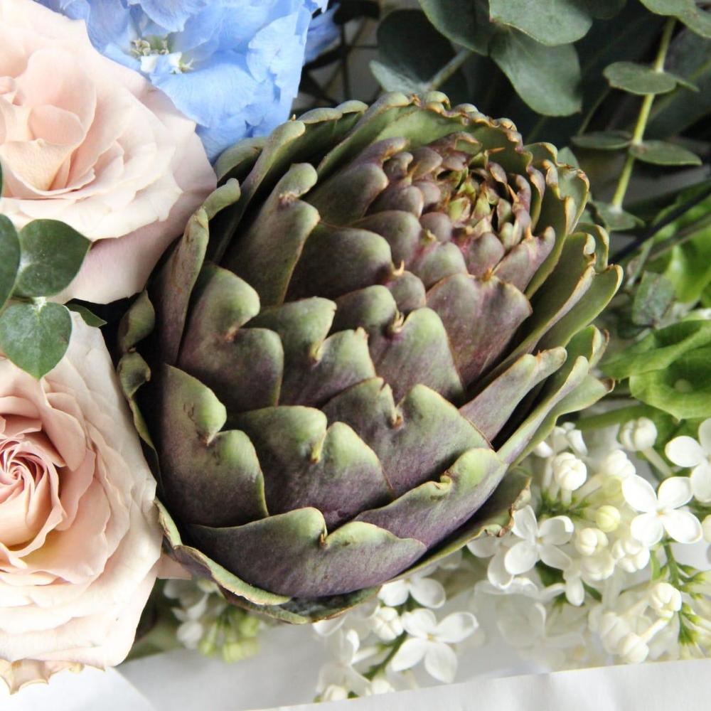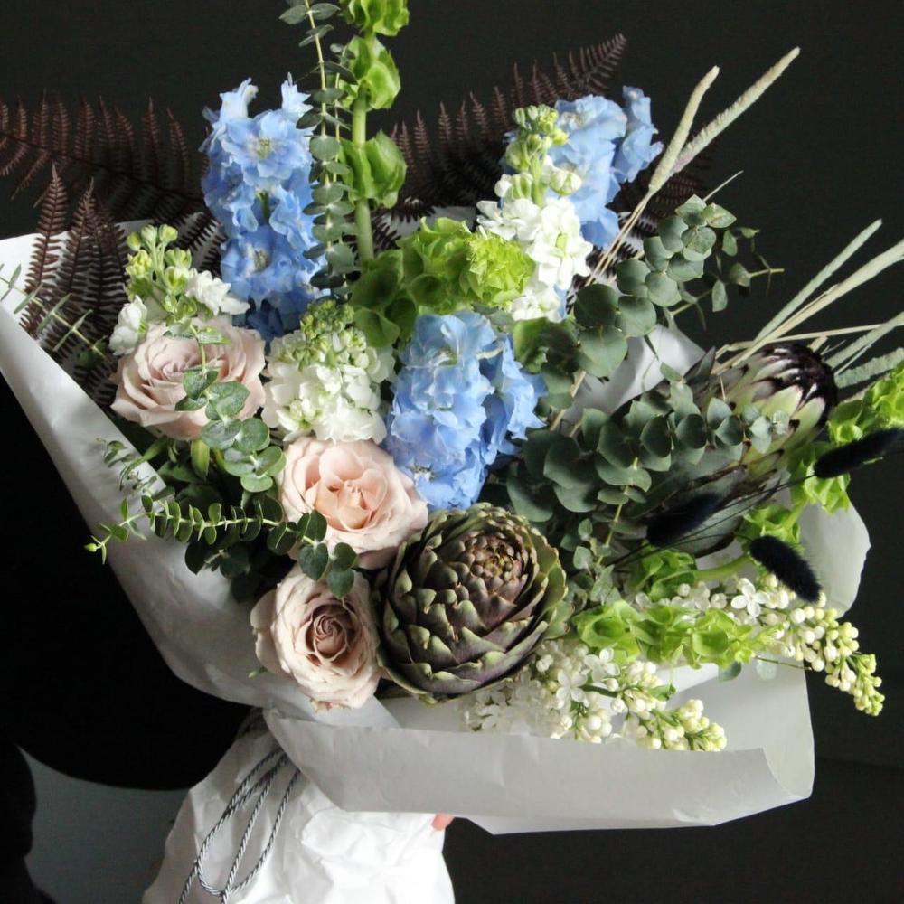 Дельфиниум – 3 шт.Маттиола – 3 шт.Сирень – 1 шт.Эвкалипт – 5 шт.Роза сортовая – 3 шт.Артишок – 2 шт.Лагурус – 4 шт.Упаковка крафт – 3 шт.папоротник стабилизированный – 1 шт.шнур декоративный – 1 шт.ирландский колокольчик – 3 шт.тимофеевка – 5 шт.