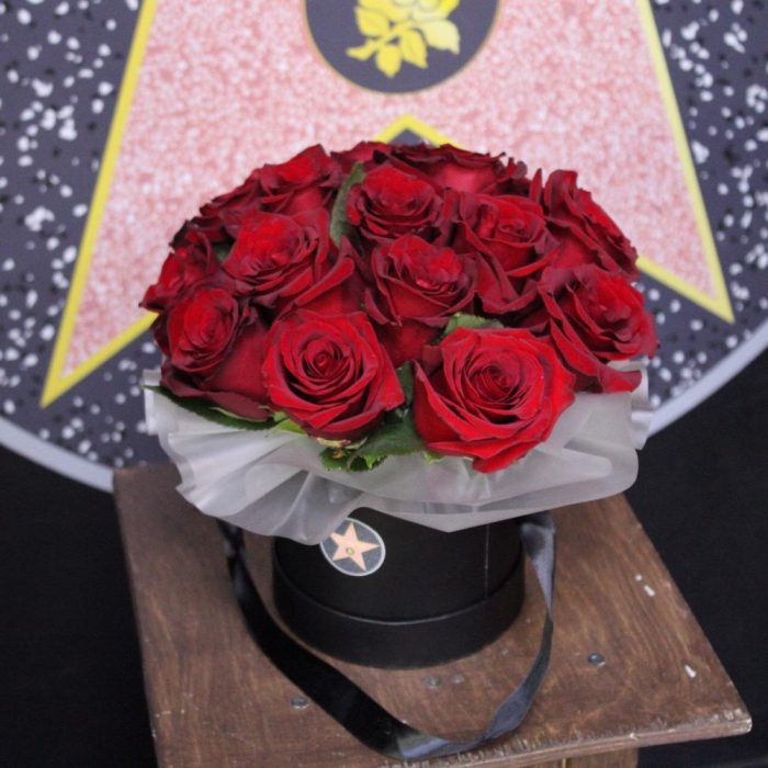 Роза Эксплорер – 15 шт.Пленка дизайнерская – 1 шт.Оазис флористический – 1 шт.Шляпная коробка – 1 шт.