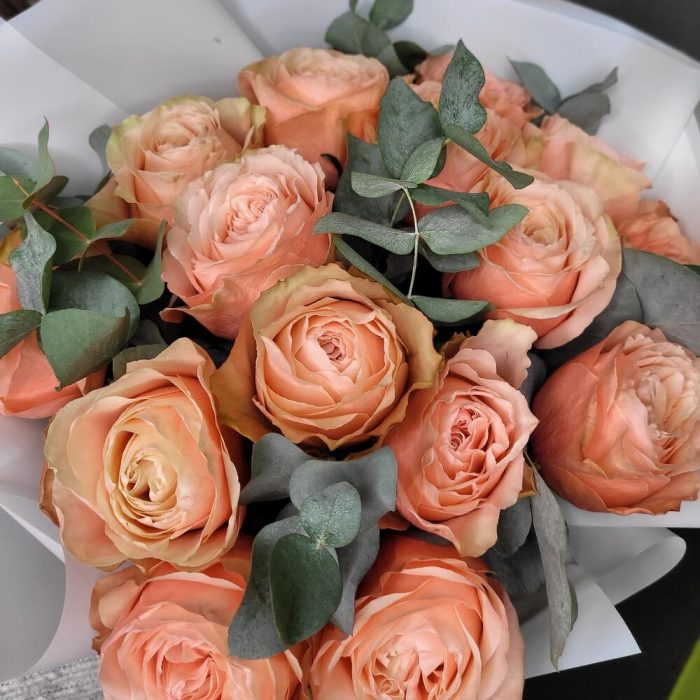 Роза Эквадор – 15 шт.Эвкалипт – 7 шт.Упаковка дизайнерская – 1 шт.Лента атласная – 1 шт.