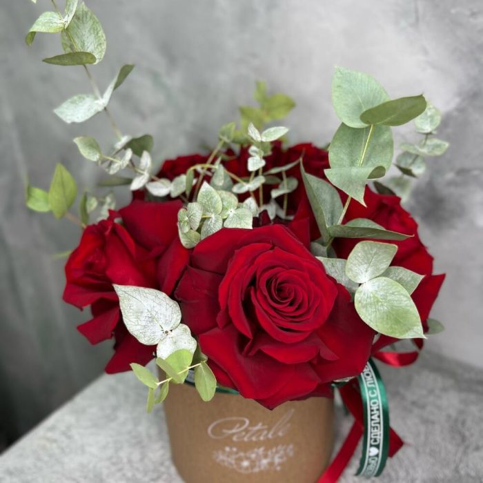 Эвкалипт – 3 шт.Роза Эквадор – 5 шт.Лента атласная – 2 шт.Коробка шляпная – 1 шт.Оазис флористический – 1 шт.