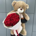 Роза красная – 35 шт. Оформление букета – 1 шт. Игрушка медведь – 1 шт.