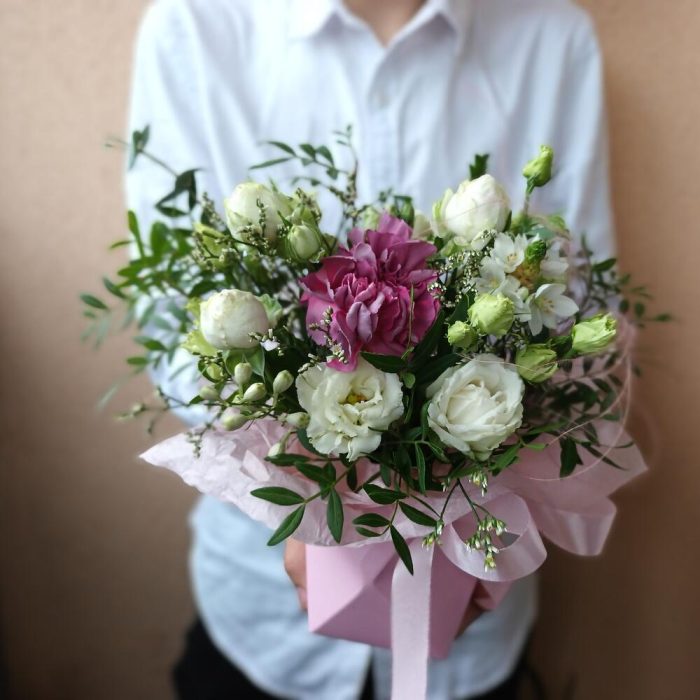 Коробка – 1 шт.Оазис флористический – 1 шт.Калька упаковка – 1 шт.Лента атласная – 1 шт.Диантус сортовой – 1 шт.Роза пионовидная кустовая – 1 шт.фисташка зелень – 1 шт.Стифа – 1 шт.Лимониум – 1 шт.Орнитогалум – 1 шт.эустома белая – 1 шт.
