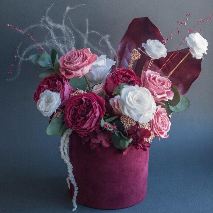 Композиция из стабилизированных цветов в бархатной шляпной коробке