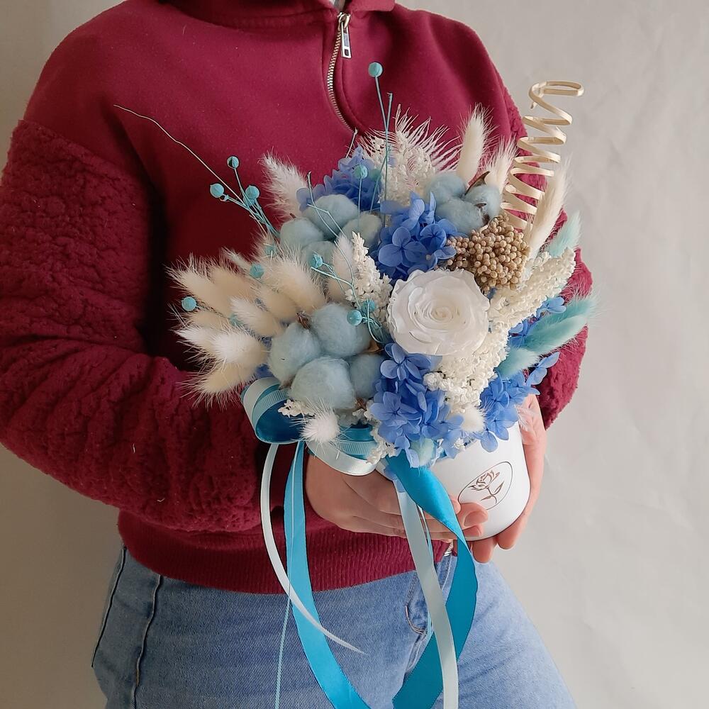 Роза стабилизированная – 1 шт.Хлопок натуральный – 3 шт.гортензия стабилизированная – 1 шт.лен натуральный пучок – 1 шт.лагурус (сухоцвет)пучок – 2 шт.озатомнус – 1 шт.перо декоративное – 1 шт.ветки декоративные – 25 шт.Оазис для сухоцветов – 1 шт.Кашпо картонное – 1 шт.Лента атласная – 3 шт.