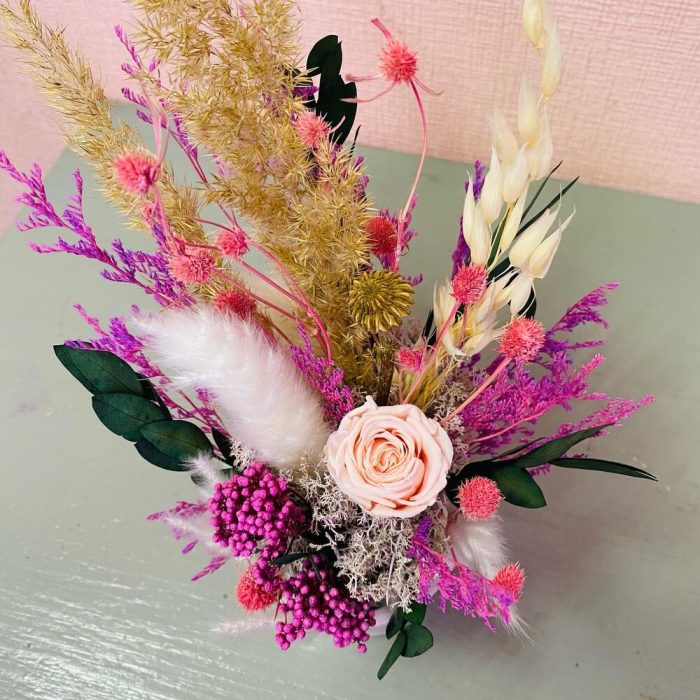 Эвкалипт – 1 шт.Роза стабилизированная – 1 шт.Кашпо керамическое – 1 шт.Мох натуральный – 1 шт.Оазис флористический – 1 шт.пампасная трава – 1 шт.овес сухоцвет – 1 шт.лимониум сухоцвет – 1 шт.эрингиум сухоцвет – 1 шт.озотамнус стабилизированный – 1 шт.