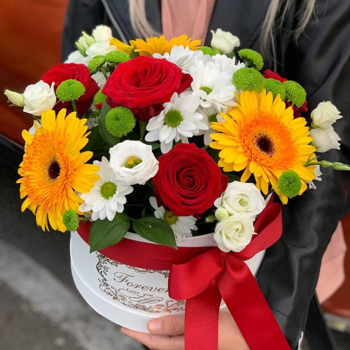 Стильная композиция в коробке из ярких оттенков цветов. Такую композицию можно подарить на любой повод или просто так – для отличного настроения.
