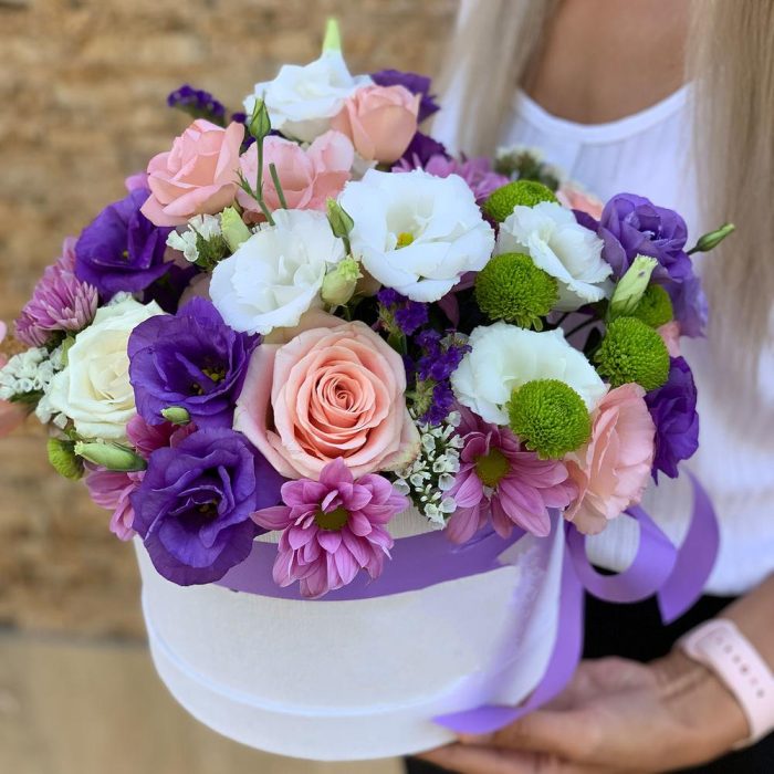 Роза розовая – 3 шт. Роза белая – 2 шт. эустома фиолетовая – 1 шт. Хризантема зеленая – 1 шт. Хризантема розовая – 2 шт. Статица синяя – 2 шт. эустома розовая – 1 шт. эустома белая – 1 шт.