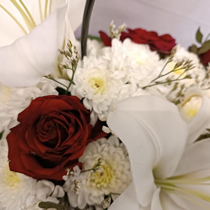 Композиция в сумке с лилией и розами