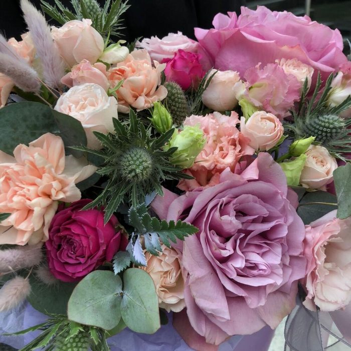 Роза пионовидная – 3 шт.Лизиантус – 3 шт.Роза бомбастик кустовая премиум – 3 шт.Гвоздика – 3 шт.роза мисти бабл пионовидная – 1 шт.Эрингиум – 1 шт.папопотник – 4 шт.Коробка – 1 шт.Оазис флористический – 2 шт.