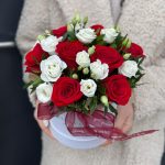 Классическая коробка с красными розами и эустомой!