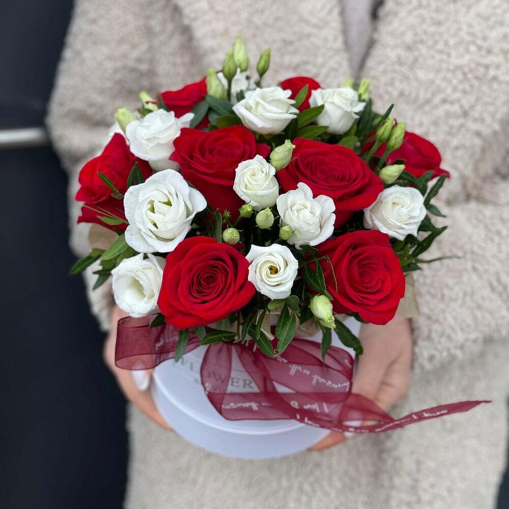 Классическая коробка с красными розами и эустомой!