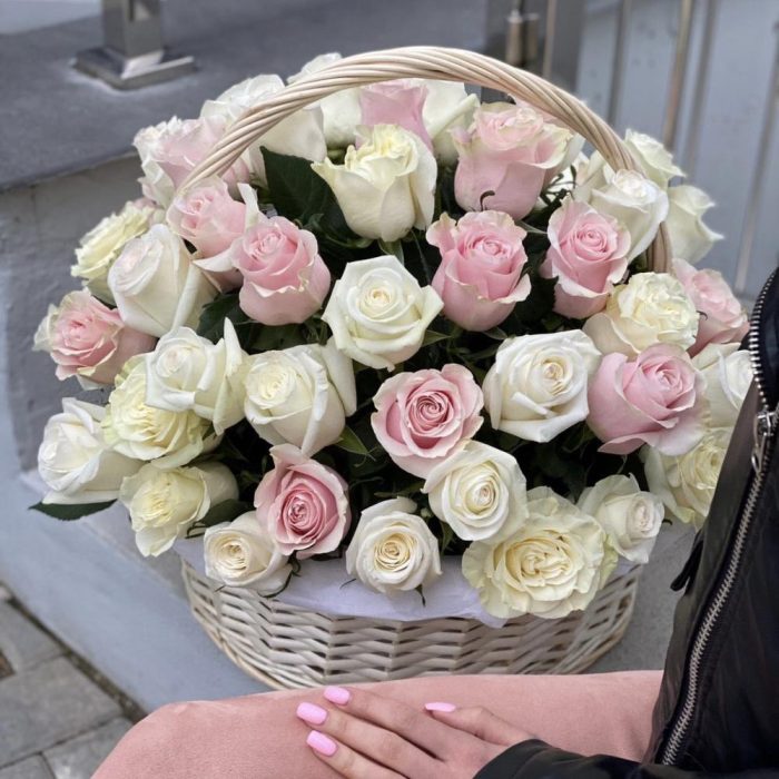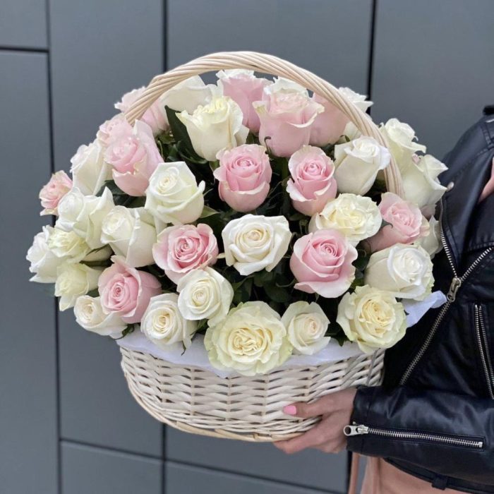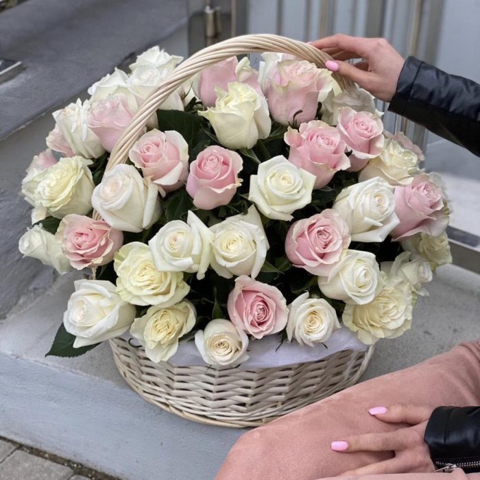 Метки: Белые розы, На свадьбу, от 5000 руб, Роза 50 см, Розовые розы, Розы в корзине, цветы в корзине