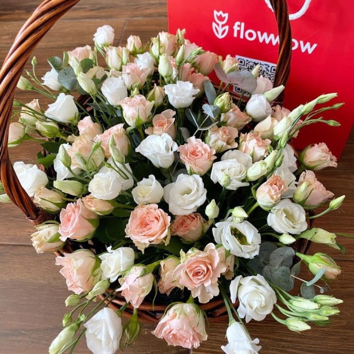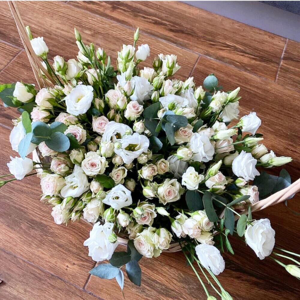 Корзина из роз и лизиантуса с эвкалиптом