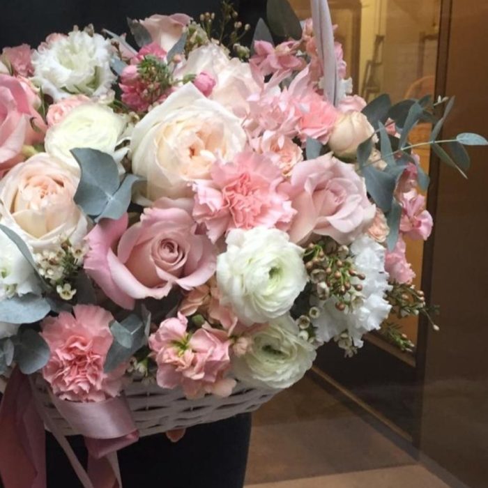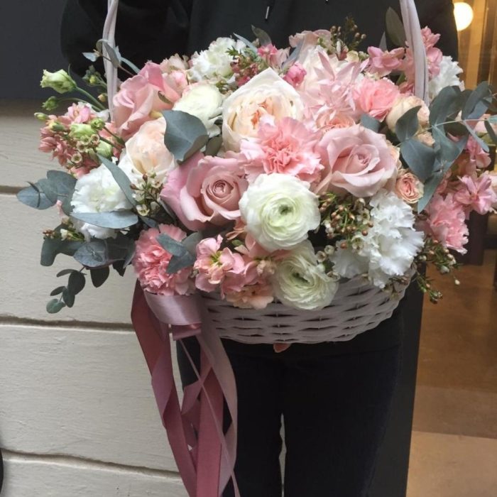 Роза – 15 шт.Ранункулюс – 3 шт.Эустома – 10 шт.Ваксфлауэр – 7 шт.Гвоздика – 10 шт.Эвкалипт – 10 шт.Корзина – 1 шт.Оазис флористический – 2 шт.Лента атласная – 345 шт.