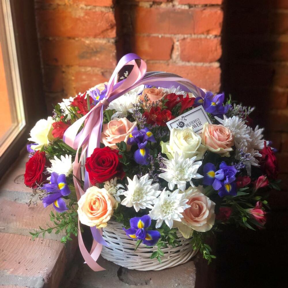 Роза – 15 шт.Ирис – 11 шт.Хризантема кустовая – 5 шт.Альстромерия – 5 шт.Лимониум – 4 шт.Корзина – 1 шт.Оазис – 2 шт.Бересклет – 5 шт.Лента – 2 шт.