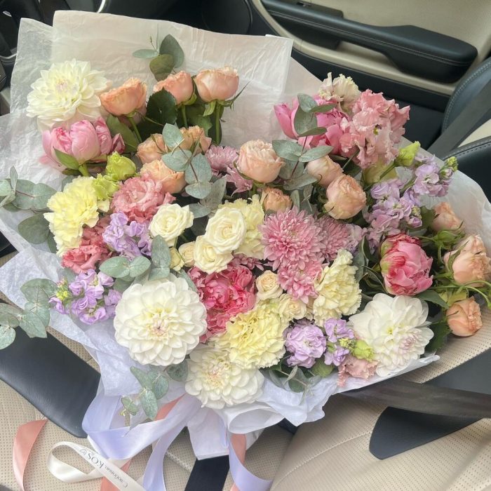 пионы сара бернар – 4 шт.Маттиола лавандовая – 4 шт.Лизиантус – 2 шт.Георгина белый – 4 шт.Диантус – 4 шт.Эвкалипт Синерия – 7 шт.Кустовая роза – 3 шт.Хризантема кустовая – 3 шт.Упаковка дизайнерская – 3 шт.Лента атласная – 2 шт.