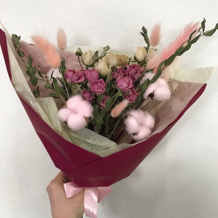 Лимониум – 1 шт.Хлопок – 4 шт.Кустовая роза – 3 шт.Лента атласная – 1 шт.Тишью – 1 шт.Упаковка дизайнерская – 2 шт.Лагурус – 6 шт.пампасная трава – 1 шт.