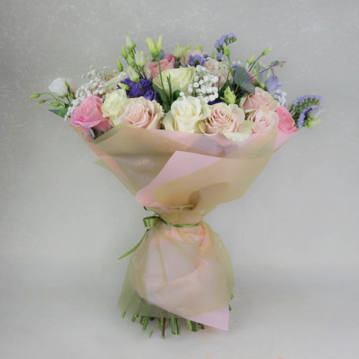 Смешанный букет из роз и гипсофилы и других цветов. Приблизительный размер 55×60.
