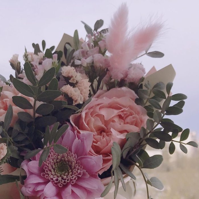 Статица – 2 шт.Хризантема – 1 шт.Пионовидная роза – 1 шт.Лагурус – 3 шт.Флористическая губка – 1 шт.листья фисташки – 1 шт.