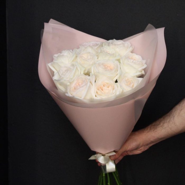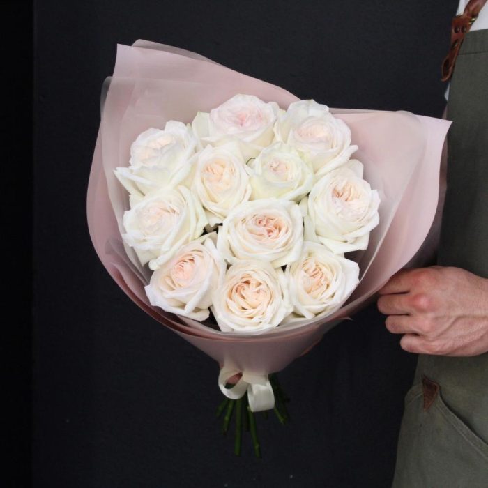 Лента атласная – 1 шт.Пленка дизайнерская – 2 шт.роза пионовидная white o’hara – 11 шт.