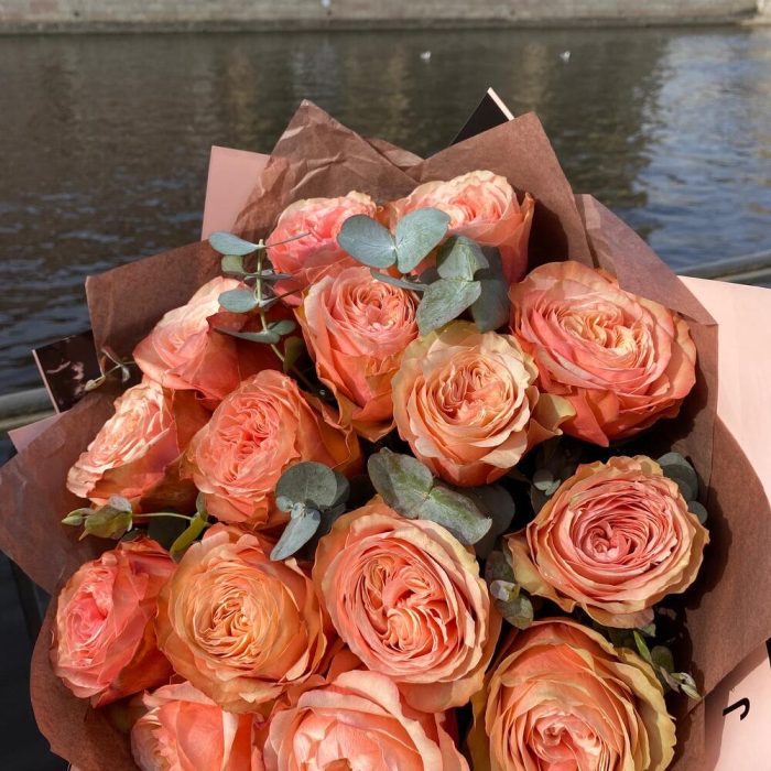 Эвкалипт – 2 шт.Лента атласная – 1 шт.Роза кахала пионовидная – 15 шт.Пленка дизайнерская – 1 шт.