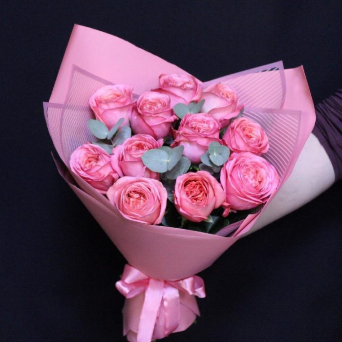 роза пионовидная пинк экспрешн – 11 шт.Эвкалипт – 3 шт.Пленка дизайнерская – 3 шт.Лента атласная – 2 шт.