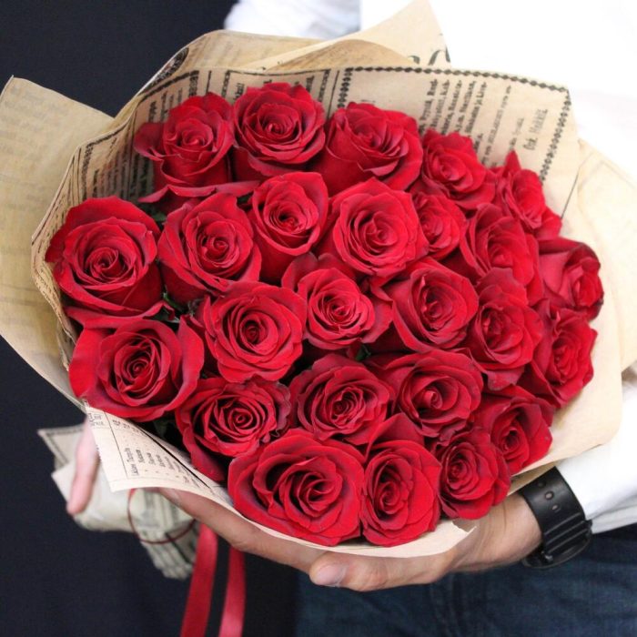 Роза Эксплорер – 25 шт.Крафт дизайнерский – 2 шт.Лента атласная – 1 шт.