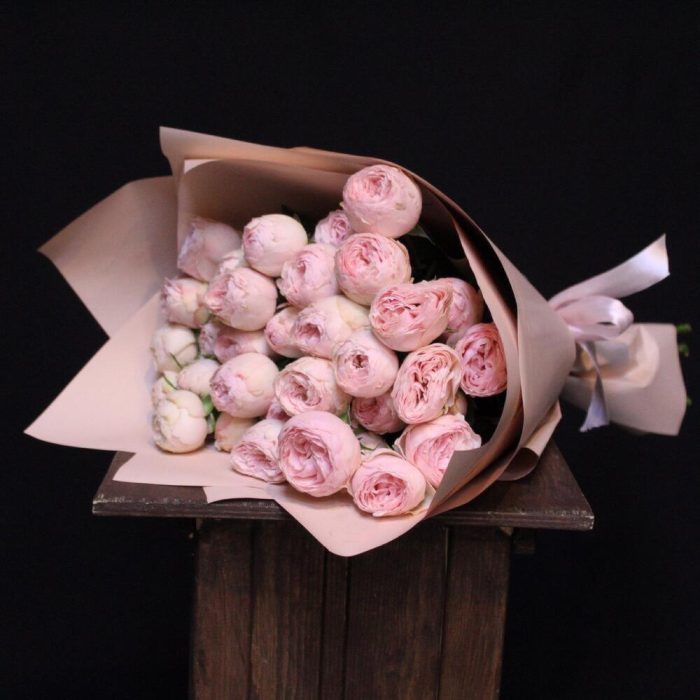 Лента атласная – 1 шт.Пленка дизайнерская – 2 шт.роза кустовая пионовидная мансфилд парк – 9 шт.