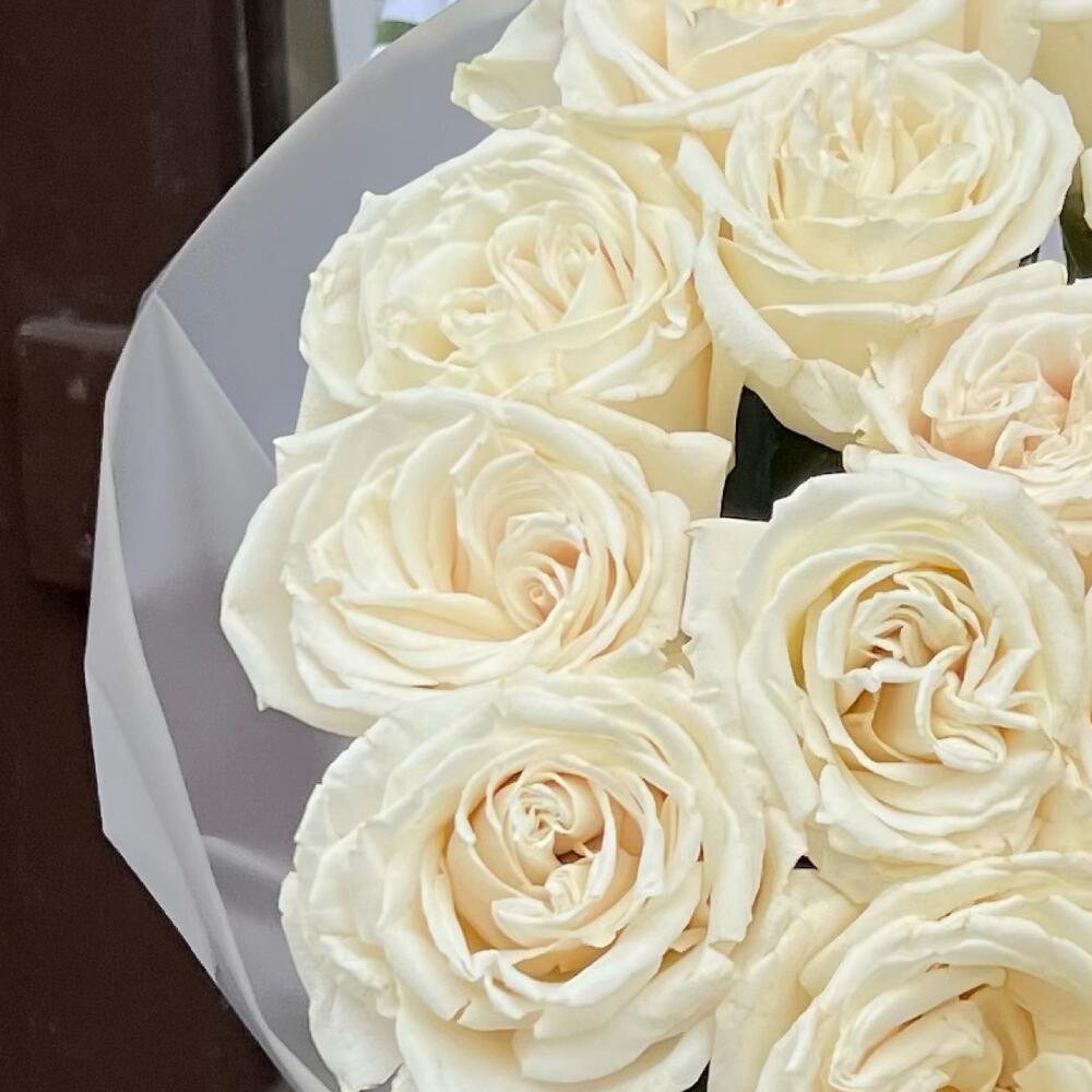 белая пионовидная роза – 15 шт.Упаковка матовая пленка – 3 шт.Лента атласная – 1 шт.Кризал (подкормка) – 1 шт.