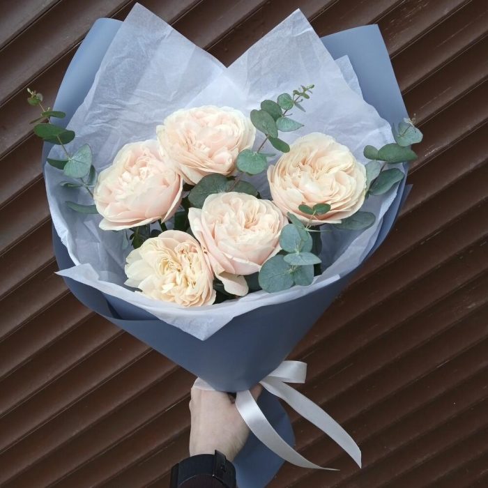 Эвкалипт – 1 шт.Лента атласная – 1 шт.Тишью – 2 шт.Пленка дизайнерская – 4 шт.white o’hara роза пионовидная ароматная – 5 шт.