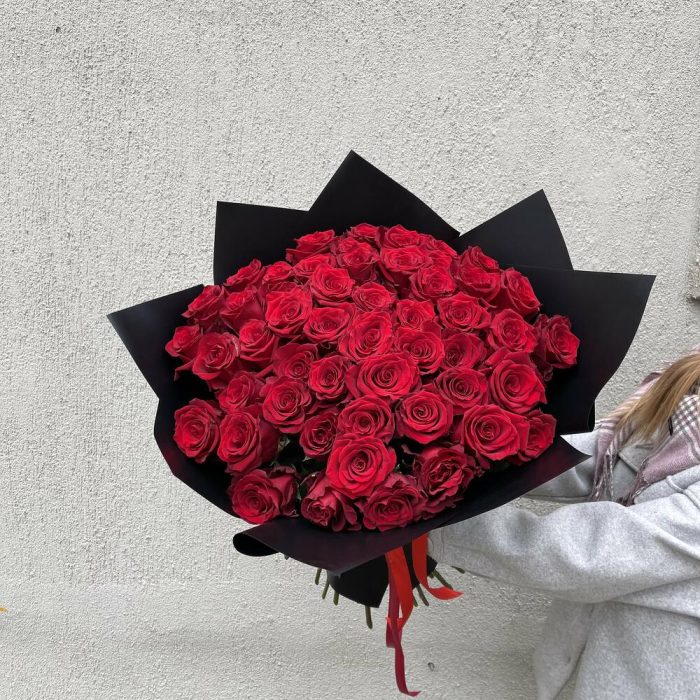 Красная роза – 51 шт. Упаковка – 1 шт. Атласная лента – 1 шт.