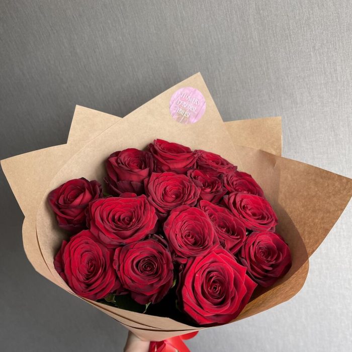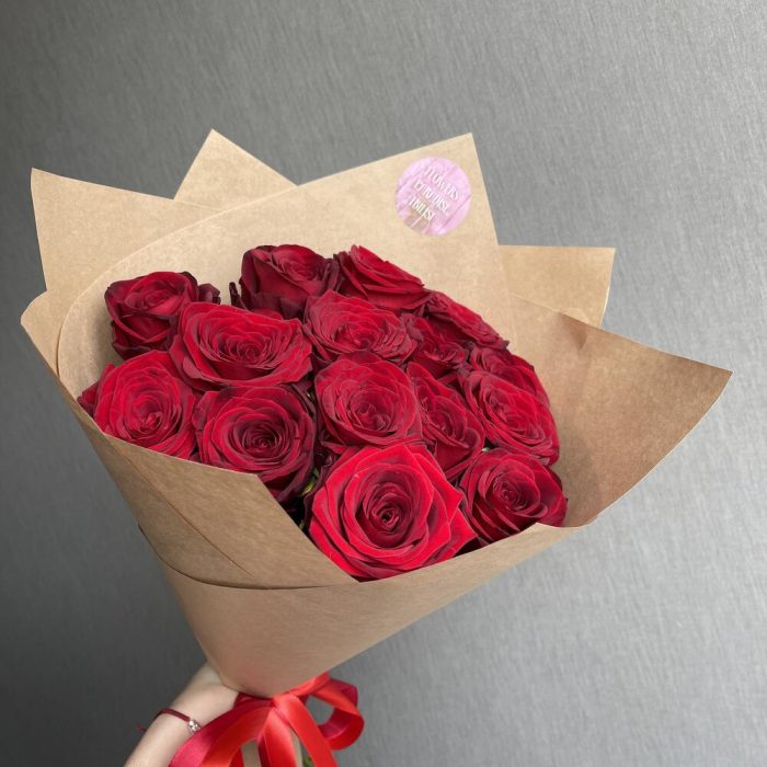 Роза красная – 15 шт. Упаковка – 1 шт. Атласная лента – 1 шт.