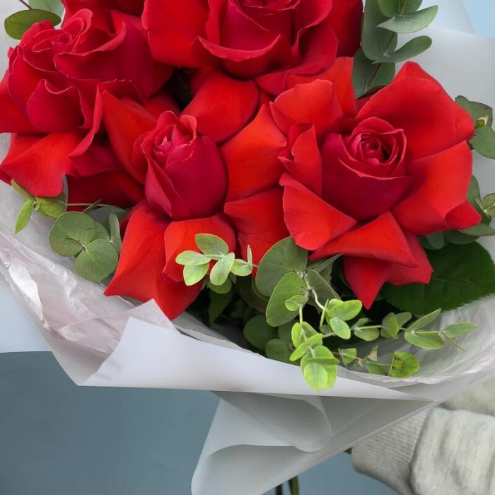 Эвкалипт – 2 шт.Лента атласная – 1 шт.Тишью – 1 шт.Упаковка дизайнерская – 1 шт.Французская роза – 5 шт.