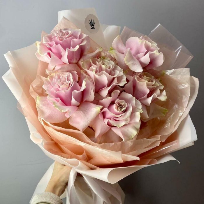 Нежный монобукет из розово-бежевых вывернутых Эквадорских роз сорта pink mondial в воздушной дизайнерской упаковке
