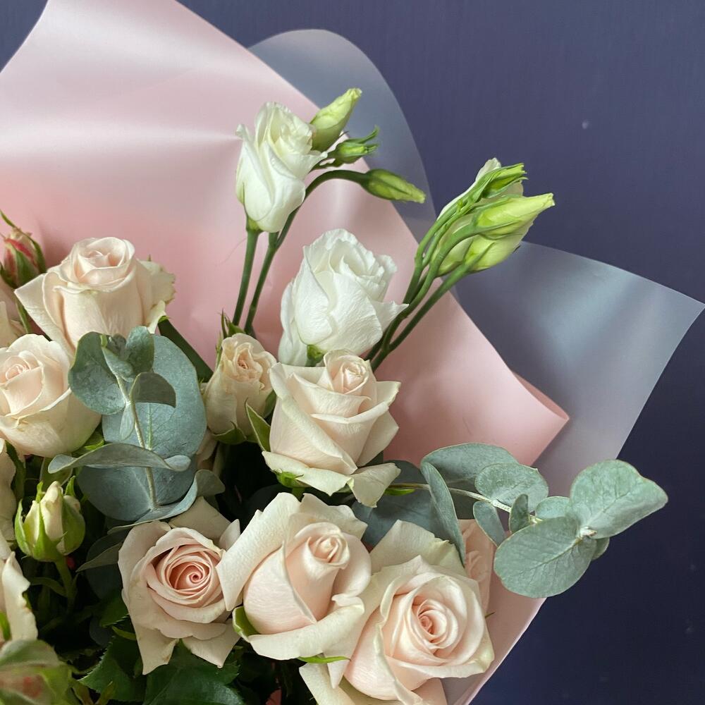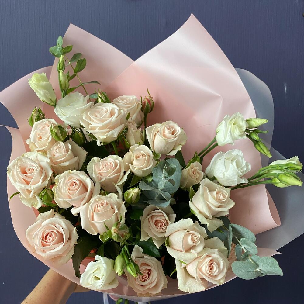 Роза кустовая – 5 шт.Лизиантус – 4 шт.Эвкалипт – 3 шт.Матовая пленка – 4 шт.Лента атласная – 1 шт.