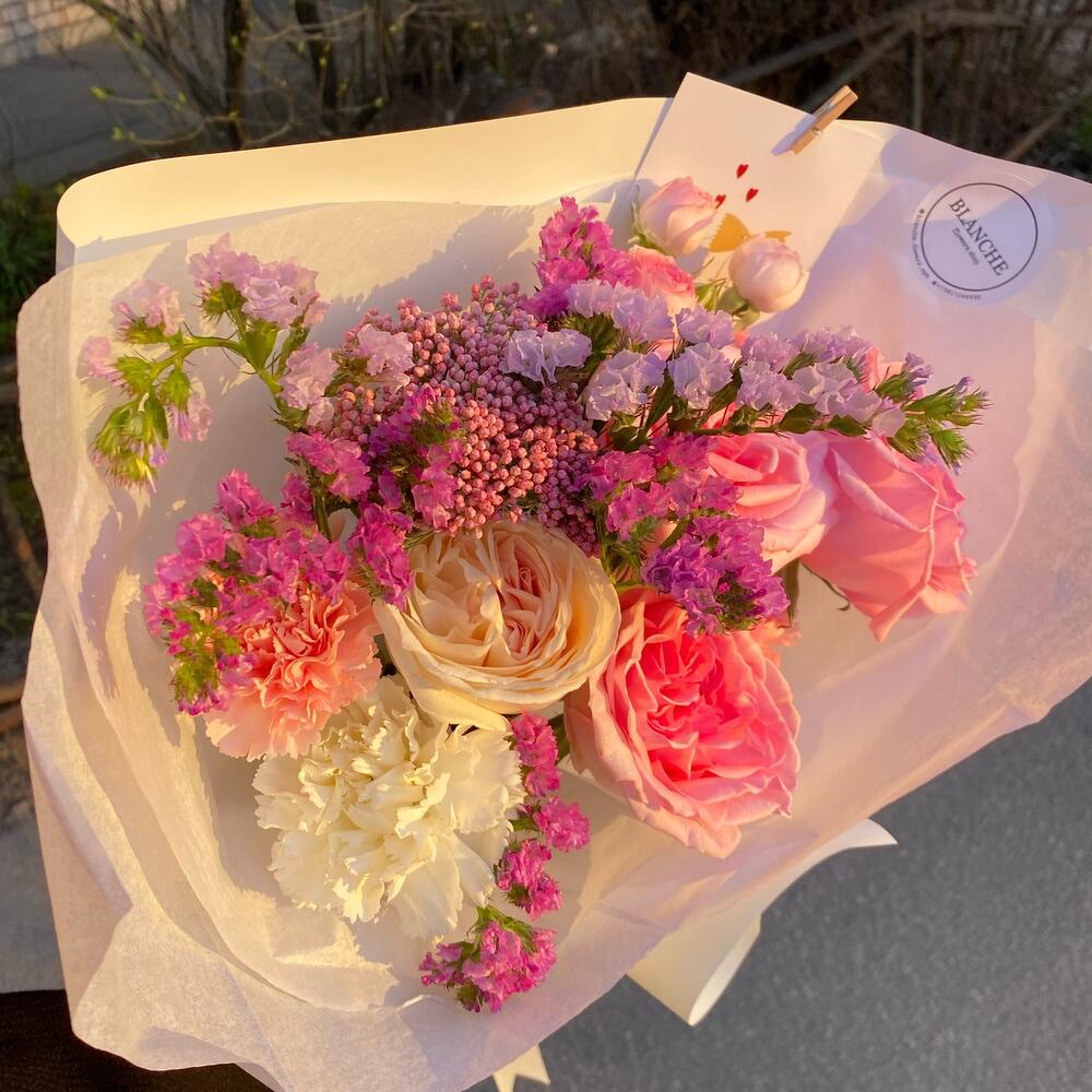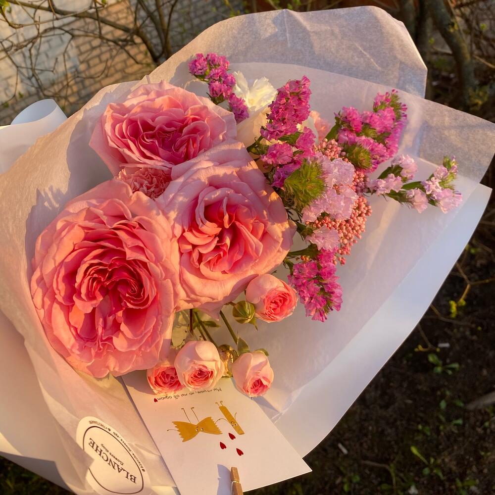 Кустовая роза – 1 шт.Диантус – 2 шт.Статица сиреневая – 5 шт.Тишью белое – 1 шт.Матовая упаковка – 1 шт.лента атласная белая широкая – 1 шт.озатомус – 1 шт.роза white o’hara – 1 шт.розы pink o’hara – 3 шт.