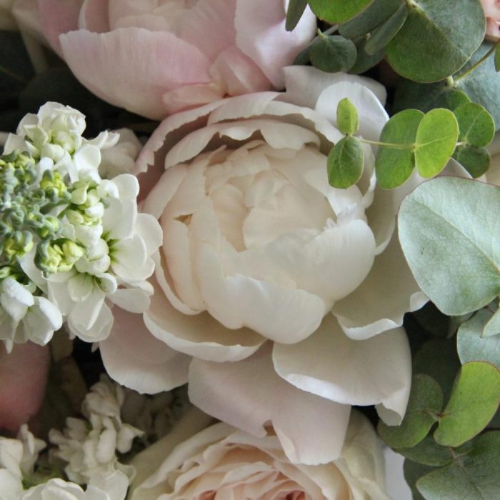 Роза пионовидная – 7 шт.Роза сортовая – 7 шт.Маттиола – 7 шт.Пион – 5 шт.Эвкалипт – 9 шт.Упаковка – 1 шт.