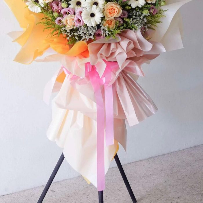 Лимониум – 10 шт.Солидаго – 10 шт.Роза – 15 шт.Эустома – 10 шт.Подставка – 1 шт.Упаковка дизайнерская – 7 шт.Оазис флористический – 6 шт.герберы – 10 шт.