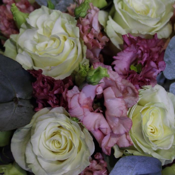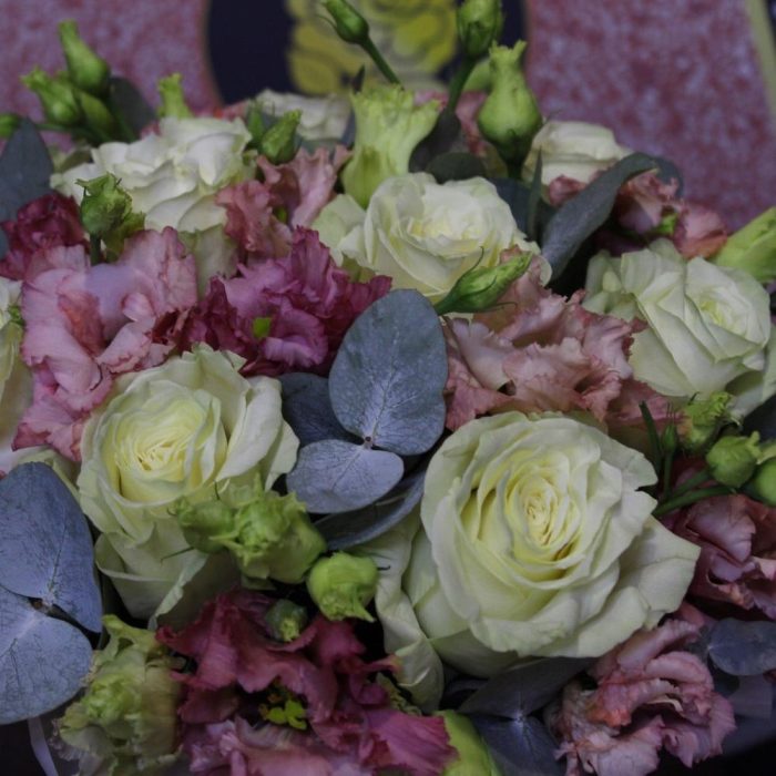 Роза Мондиаль – 9 шт.эустома махровая – 5 шт.Эвкалипт – 2 шт.Пленка дизайнерская – 1 шт.Оазис флористический – 1 шт.Лента атласная – 2 шт.Шляпная коробка – 1 шт.