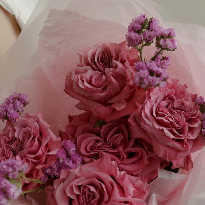 Статица – 2 шт.Роза Эквадор – 5 шт.Упаковка дизайнерская – 1 шт.инструкция по уходу за цветами – 1 шт.любовь флориста – 100 шт.открытка с вашим текстом – 1 шт.подкормка для цветов – 1 шт.медиант ручной работы из бельгийского шоколада – 1 шт.