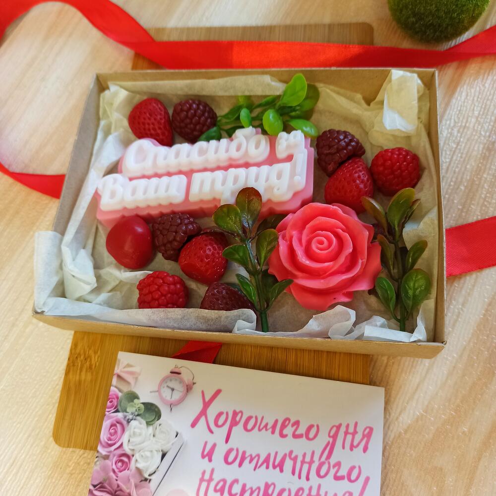 Мыло ручной работы в наборе Спасибо за ваш труд. Это подарок комплимент учителю, воспитателю, врачу. Любому человеку, которого Вы хотите отблагодарить, можно подарить этот милый презент. Мыло ручной работы душистое, запах фруктовый. В составе мыла есть глицерин, поэтому … Показать ещёоно не сушит кожу рук и прекрасно мылится. Этот подарочный набор дарят на выпускной в школе или детском садике, на 1 сентября, на день учителя, на день воспитателя, на новый год, на 8 марта.