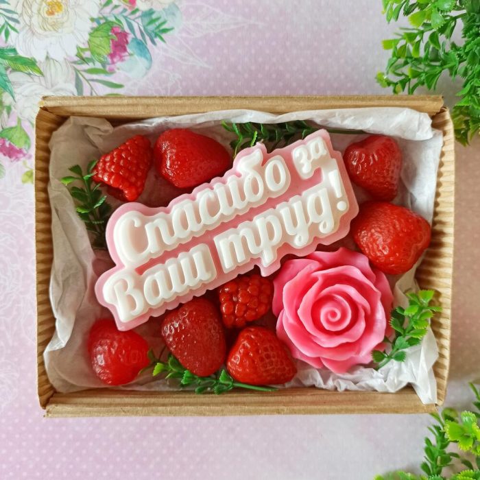 Искусственная зелень – 3 шт.мыло надпись спасибо за ваш труд – 1 шт.Мыло роза – 1 шт.мыльные ягодки – 10 шт.