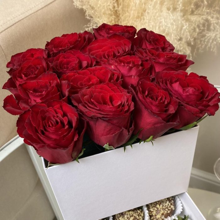 Подарочный набор в шкатулке с красными розами и клубникой в шоколаде
