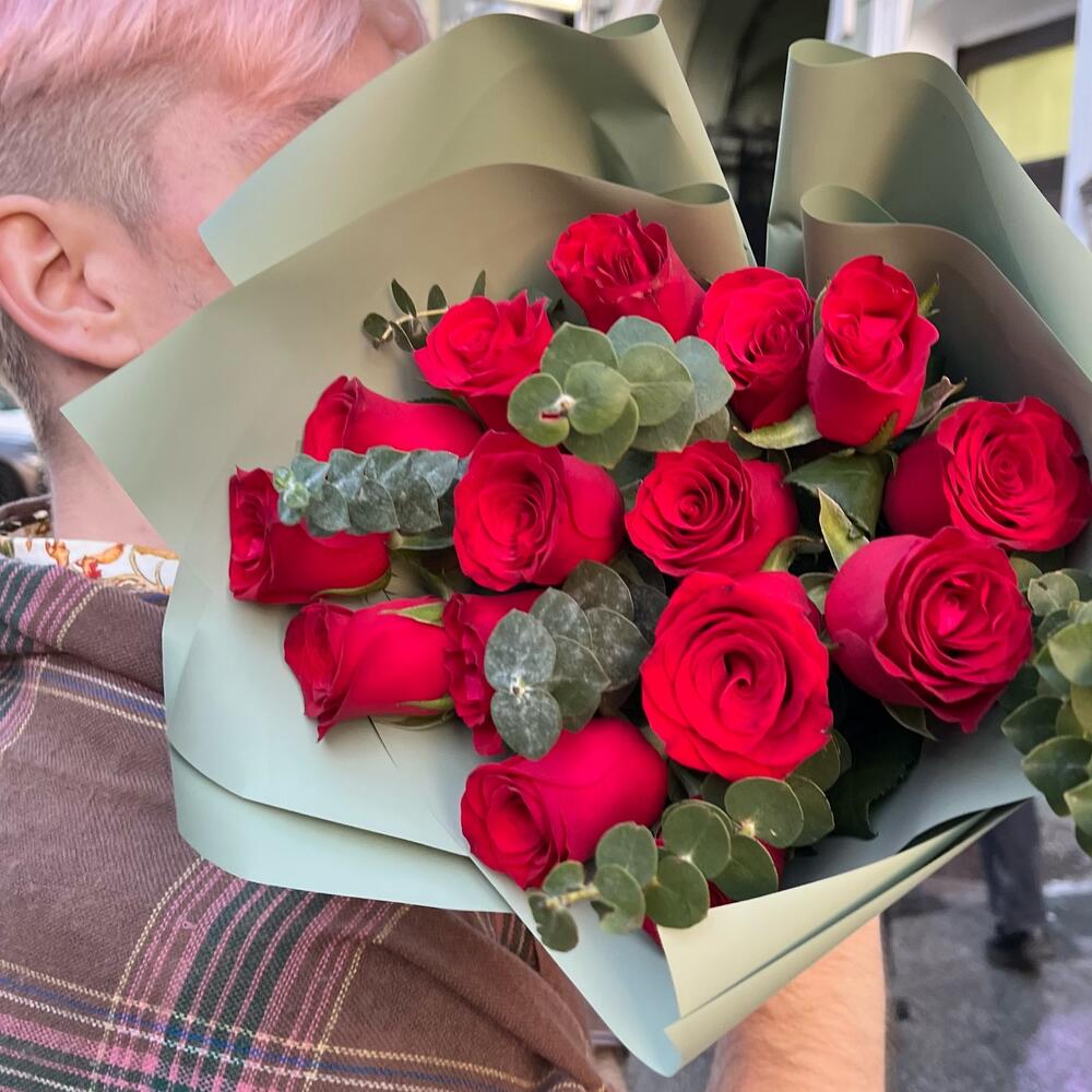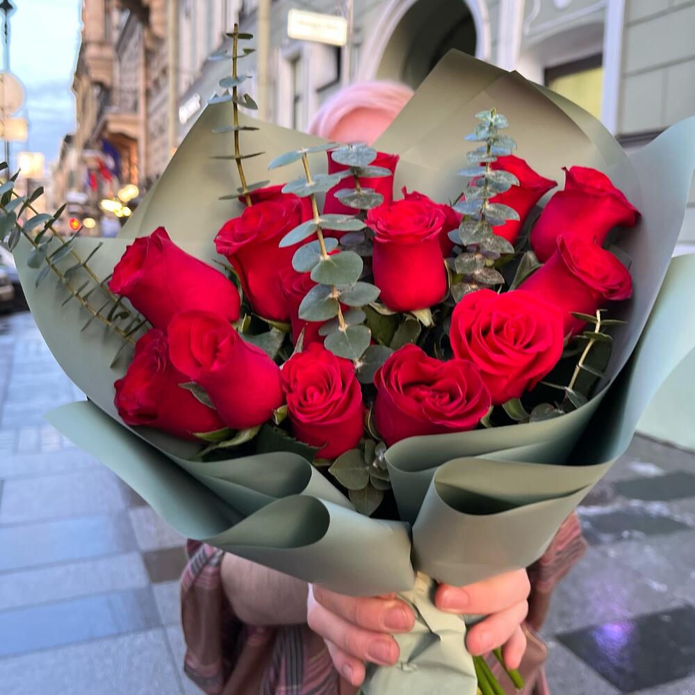 RED LOVE 15 красных роз с эвкалиптом в упаковке