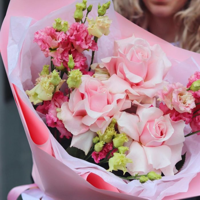 Розовый букет-комплимент с французскими розами и лизиантусом